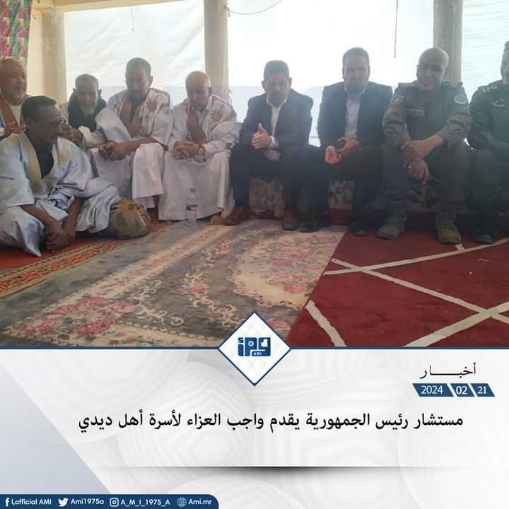 قدم المستشار برئاسة الجمهورية السيد سيدي محمد ولد سيدي جعفر، رفقة والي لعصابه السيد عبد الرحمن ولد الحسن، اليوم الأربعاء بحي سكطار في مدينة كيفه، تعازي رئيس الجمهورية السيد محمد ولد الشيخ الغزواني، لأسرة أهل ديدي في وفاة المغفور له بإذن الله تعالى سيدي عالي ولد ديدي، الذي وافاه الأجل المحتوم مؤخرا، راجيا له الرحمة والغفران وأن يسكنه المولى فسيح جناته ويلهم ذويه الصبر والسلوان.
