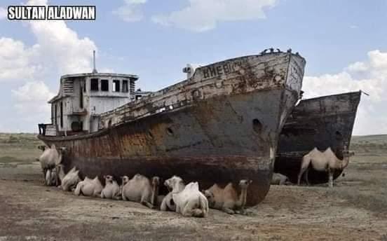 في آسيا الوسطى بين أوزباكستان و كازخستان... هل سمعت يوما عن "بحر_أرآل"؟؟ الذي أصبح يسمى الآن "مقبرة السفن" لقد كان يعج بالسفن والحياة، لكن منذ عام 1970م بدأ بالجفاف إلى أن وصل في عام 2008م لمرحلة جفاف شبه تام.. هل تخيلت أن ترى سفنا غارقة في رمال الصحراء تستظل تحتها الجمال