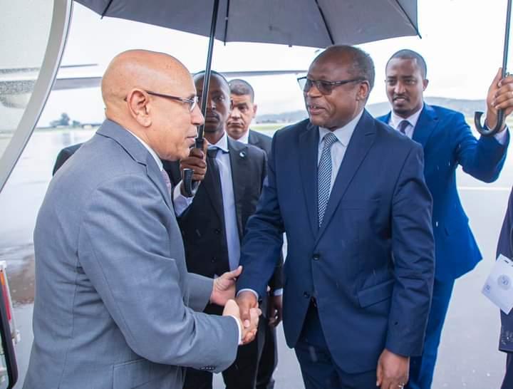 وكان في استقبال فخامة رئيس الجمهورية لدى وصوله مطار كيغالي الدولي، وزير المالية الرواندي الدكتور أوزيل نداكجيمانا (Dr. Uzziel Ndagijimana)، وسعادة سفيرة بلادنا المعتمدة في رواندا، الممثلة الدائمة لدى الاتحاد الأفريقي السيدة خديجة أمبارك فال.
