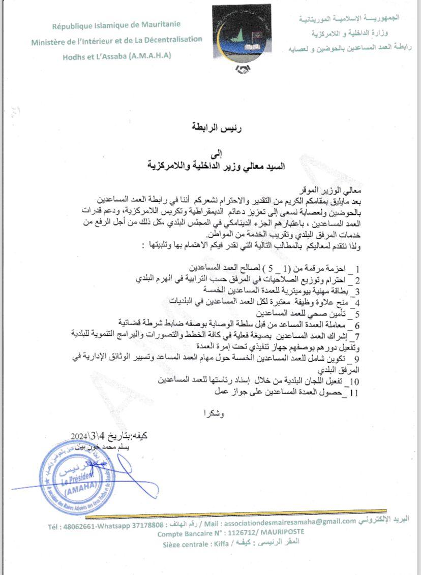 ( الساطع الاخباري ) علمت وكالة الساطع الاخباري ان رابطة العمدة المساعدين بالحوضين ولعصابه بعثت رسالة في الرابع من شهر مارس 2024 لمعالي وزير الداخلية واللامركزية