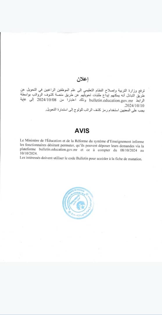 Oct 08 / التعليقات وزارة التربية تفتح باب التبادل من 8 اكتوبر حتى 10أكتوبر(وثيقة) ثلاثاء, 2024/10/08 - 18:22