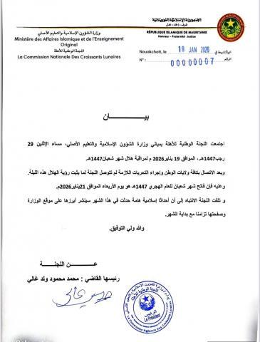 أعلنت لجنة مراقبة الأهلة إن فاتح شهر شعبان للعام الهجري 1447 سيكون يوم الأربعاء القادم الموافق للحادي والعشرين من يناير الجاري. وأصرت اللجنة في بيانا تعذر رؤيةض الهلال مساء اليوم الاثنين. وذلك بعد الاتصال بكافة ولايات الوطن وإجراء التحريات اللازمة لم تتوصل لما يثبت رؤية الهلال هذه الليلة.