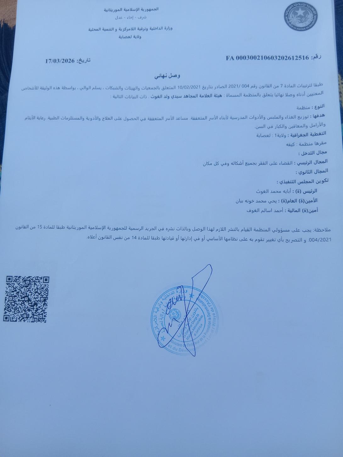 أعلن اليوم الخميس المواقف 19 مارس 2026 في مدينة كيفه عن قيام هيئة تحت إسم : هيئة العلامة المجاهد : سيدي ولد الغوث ، حائزة على الترخيص رقم : fa0003002010603202612516 , وتتخذ من مدينة كيفه مقرا لها ، ومن بين  أهدافها :